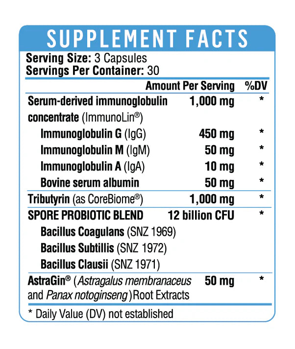 ImmunoLin® is the branded ingredient serum-derived bovine immunoglobulin/protein isolate (SBI) with over 40 human studies demonstrating its clinical efficacy in digestive and immune health. SBI has been shown to be a broad-spectrum modulator of the immune system by targeting excessive or imbalanced immunity.* In addition, ImmunoLin® works by binding, neutralizing, and removing pathogenic bacteria, viruses, and other gut irritants that can lead to inflammation.* It also helps to repair the gut lining and restore gut homeostasis.*
