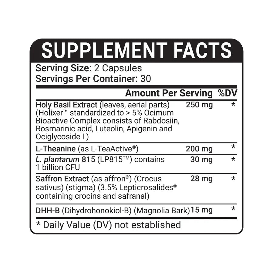 Serenity features a specialized form of Holy Basil called Holixer™ which is a patented and extensively researched preparation standardized to contain at least 5% Ocimum Bioactive Complex, a unique blend of bioactive compounds including Rabdosin, Rosmarinic acid, Luteolin-7-o-beta-glucuronide, Ociglycoside I, and Apigenin-7-o-beta-glucuronide.